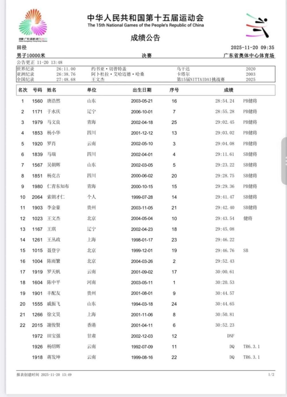 第十五届全国锦标赛男子10000米比赛20日上午结束。在当天下午公布的官方成绩中,比赛中率先冲线的云南队姜发坤的成绩被取消。山东省队唐浩然以28分54.24秒的成绩获得冠军。图为上午比赛公布的男子10000米成绩,蒋发琨的赛程还剩一圈半,跑在他前面开始落后的云南队杨绍辉突然加速,蒋发琨冲刺取得领先。江华坤终于主动了。不过,赛后,男子10000米的成绩却迟迟没有公布。在下午公布的最终成绩中,蒋发军和杨绍辉的成绩均被取消,取消原因被列为“TR6.3.1”。这表明他的ac此举违反了世界田径协会颁布的《田径技术规则》第6.3.1条规定,落后或落后圈数的运动员不能为其他运动员提供配速支持。辽宁队于水清和青海队马文亮分别获得银牌和铜牌。
