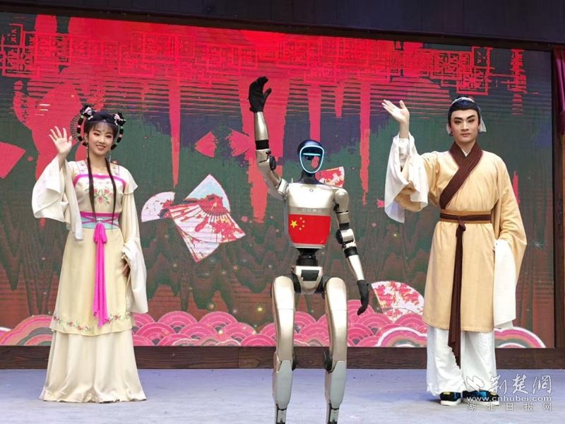 荆楚网(湖北日报)(望京通讯员 费刘曼 通讯员)国庆中秋节期间,黄梅县东山文梅村,当黄梅戏经典唱段《小妾》响起时,机器人灵活地挥动手臂,转身表演悠扬的歌声。雕塑戏曲人物神韵。歌剧结束前,身着传统狮头服装的机器狗跳到舞台前,随着鼓点跳跃,波浪状的鬃毛展现出敏捷的身姿,吸引游客纷纷用手机拍照,镜头跟随这些“特技演员”。